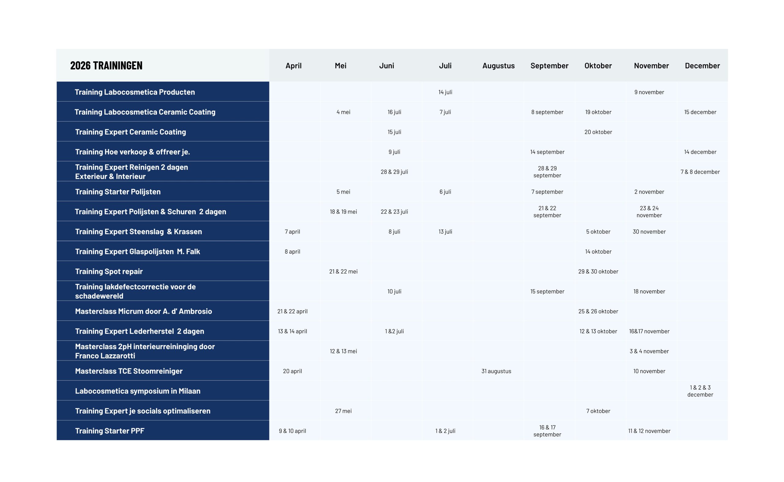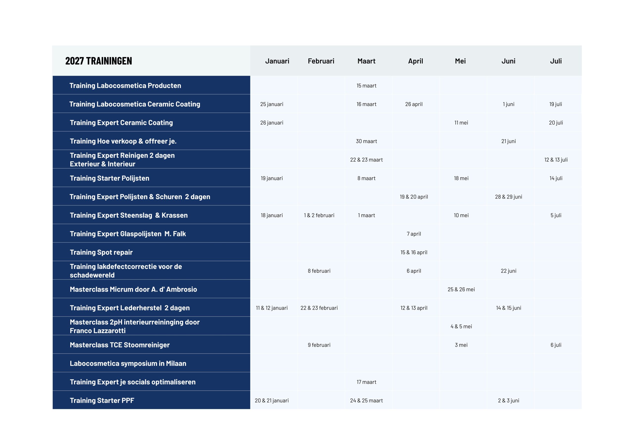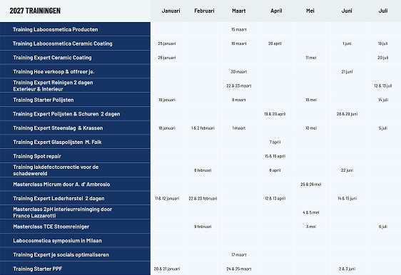 Wil je precies weten wanneer er een car detailing cursus van Glansz plaatsvindt? Wij hebben alles overzichtelijk voor je op een rijtje gezet. Download direct ons complete jaaroverzicht voor 2026 of 2027. Zo zie je in één oogopslag per maand welke auto detailing trainingen er op de planning staan en kun je jouw jaar perfect voorbereiden.